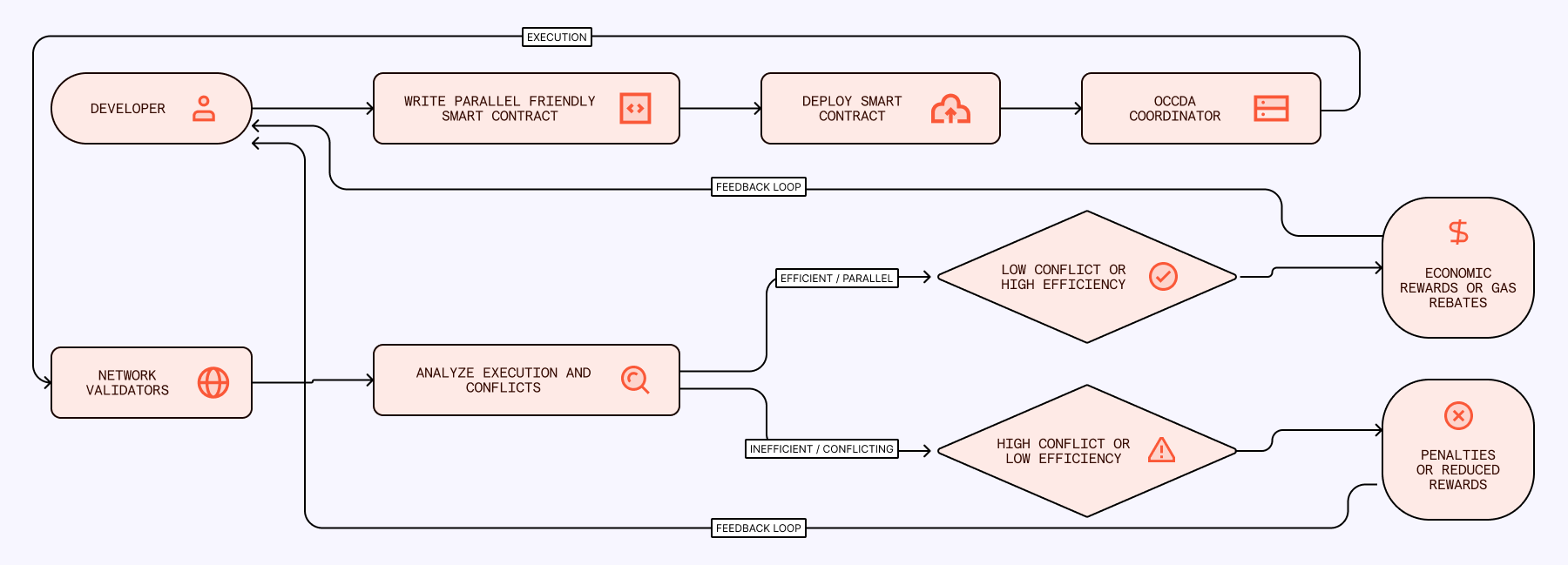 The Open Execution Network is an economic model designed to align developer incentives with systemic performance. Facilitated by the OCCDA Coordinator, the network provides deterministic proof of how and why computational conflicts occur. This transparency allows the system to economically reward developers who write efficient and parallel-friendly code. Applications designed to avoid state-access locks benefit from lower execution costs, creating a feedback loop that optimizes the entire ecosystem for high-speed concurrency.