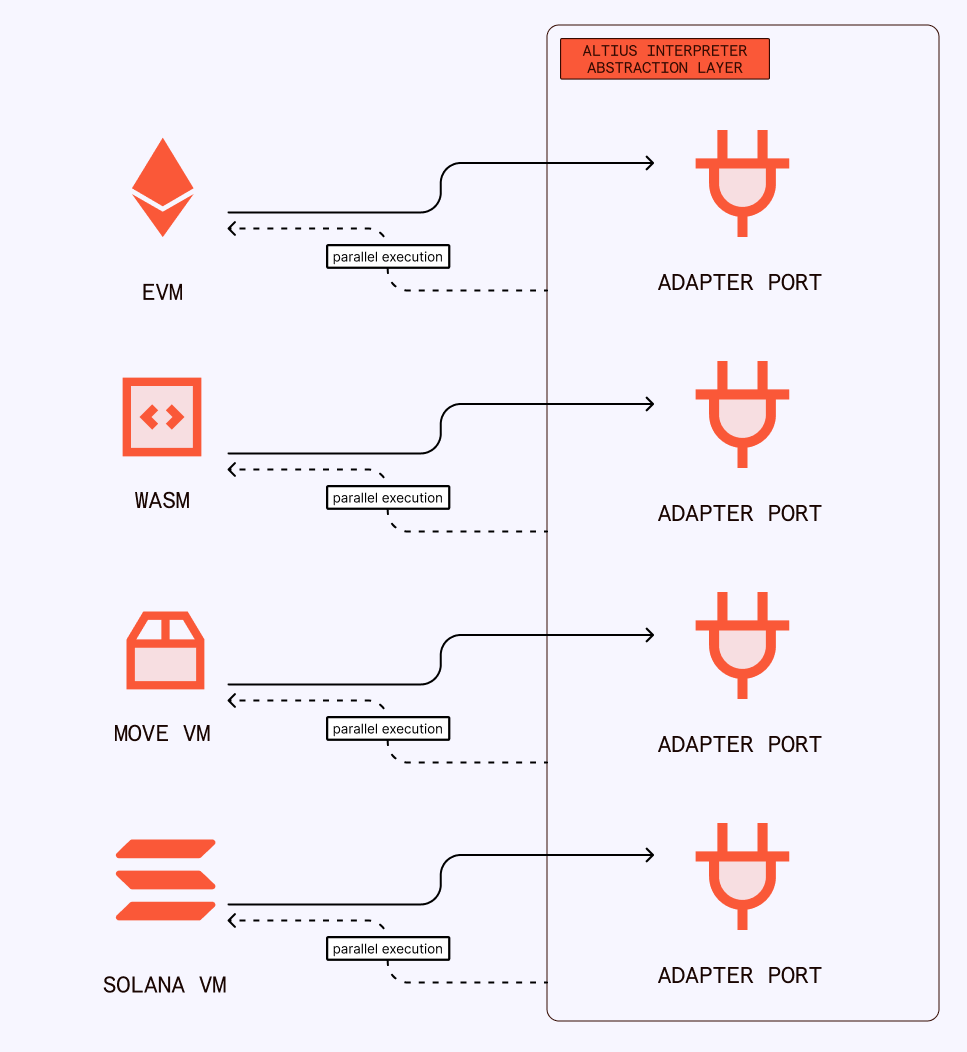 Altius is designed for a diverse technological landscape where multiple execution standards coexist. The Interpreter functions as a universal abstraction layer that allows various virtual machines, such as EVM, WASM, or MoveVM, to be integrated as modular components.