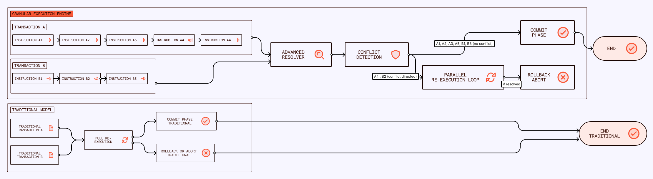 When a data conflict occurs, the engine isolates and re-executes only the specific conflicted instructions rather than restarting the entire transaction. This process is managed by the OCCDA Coordinator to minimize wasted computation and resource locking, enabling a level of throughput that is unattainable through sequential or coarse-grained parallel methods.